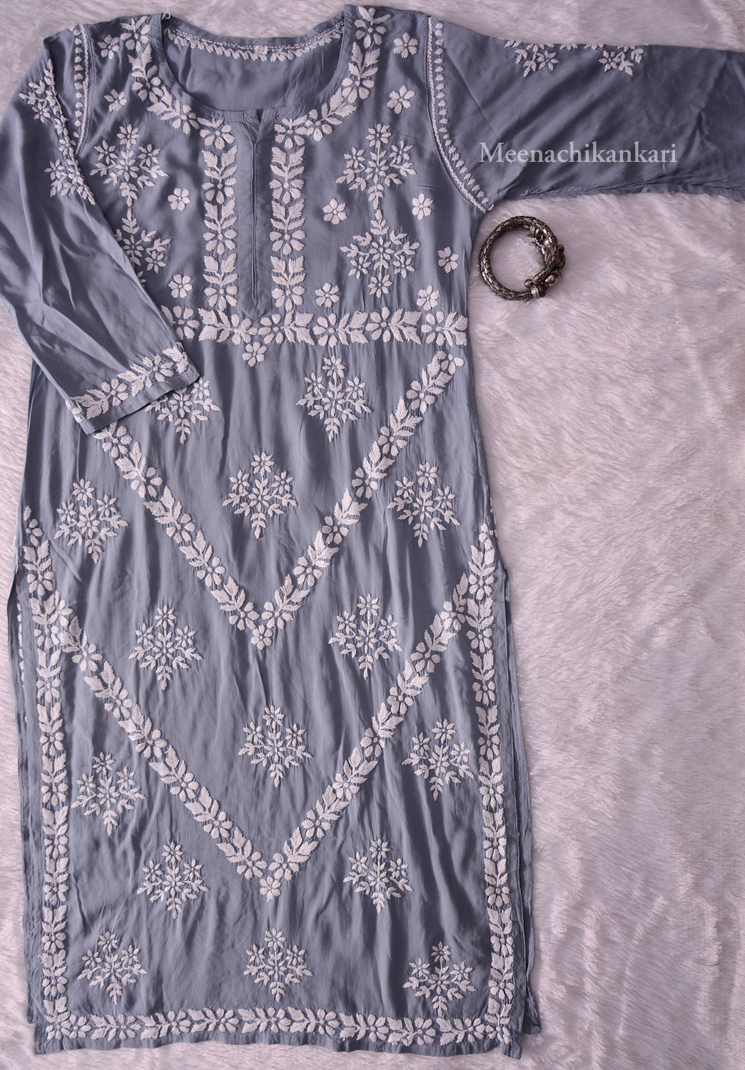 Experience elegance with the Ahana Grey Modal Kurta Set, featuring a long straight kurta adorned with exquisite Chikankari embroidery. Crafted from premium thin, non-transparent modal fabric, it offers comfort and sophistication. The round neck and 3/4 sleeves complement the 44 to 46-inch length, delivering a graceful silhouette. Paired with matching palazzo pants, this set embodies the refined artistry of Lucknow’s hand-embroidered Chikankari, showcasing intricate needlework that enriches your wardrobe with timeless charm.